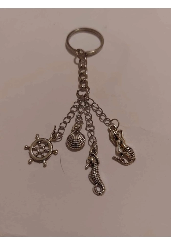Keyring with a ships wheel, a seahorse, a mermaid and a shell.