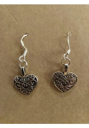 Silver plated hearts with various swirled patterns in the middle. They are finished with silver ear wires and a jump ring holding everything together.