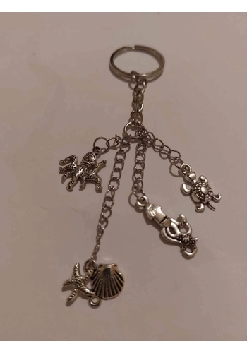 A keyring with a turtle, a squid, a starfish with a shell and an octopus.